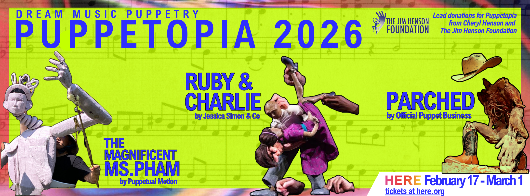 HERE’s Dream Music Puppetry program presents PUPPETOPIA! A winter review of HERE’s puppetry state of mind; Dream Music’s annual celebration of imagination, possibility, exciting techniques and community creation. Featuring the World Premiere of PARCHED by Official Puppet Business, RUBY & CHARLIE by Jessica Simon & Co, and THE MAGNIFICENT MS. PHAM by Puppetual Motion. Puppetopia is presented with the support of The Jim Henson Foundation.